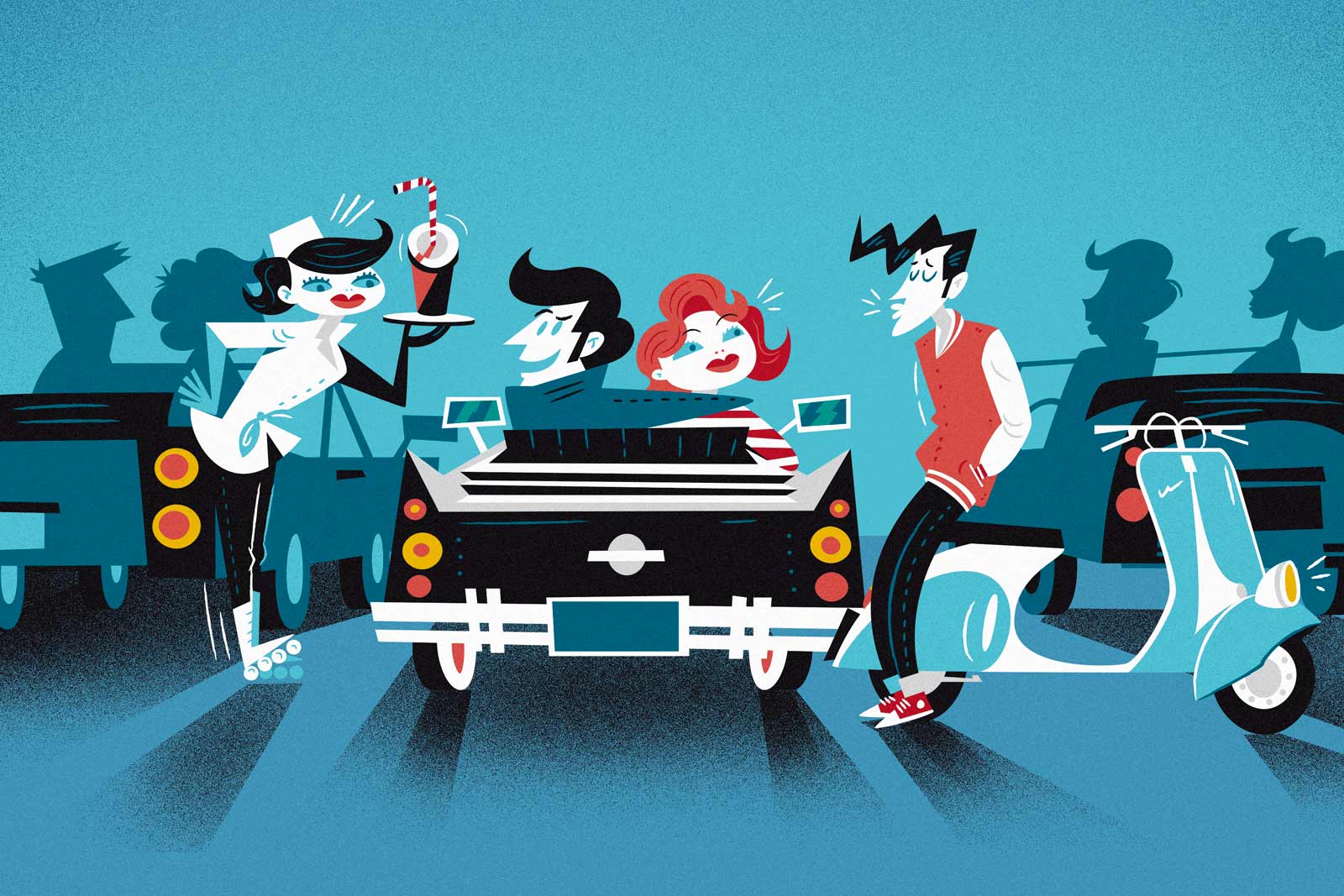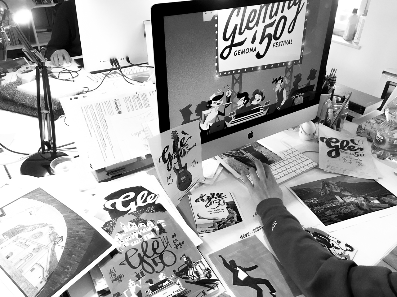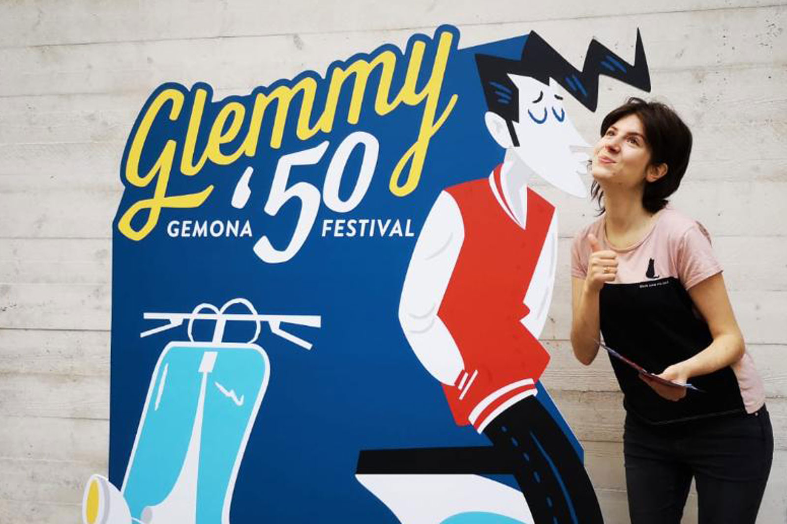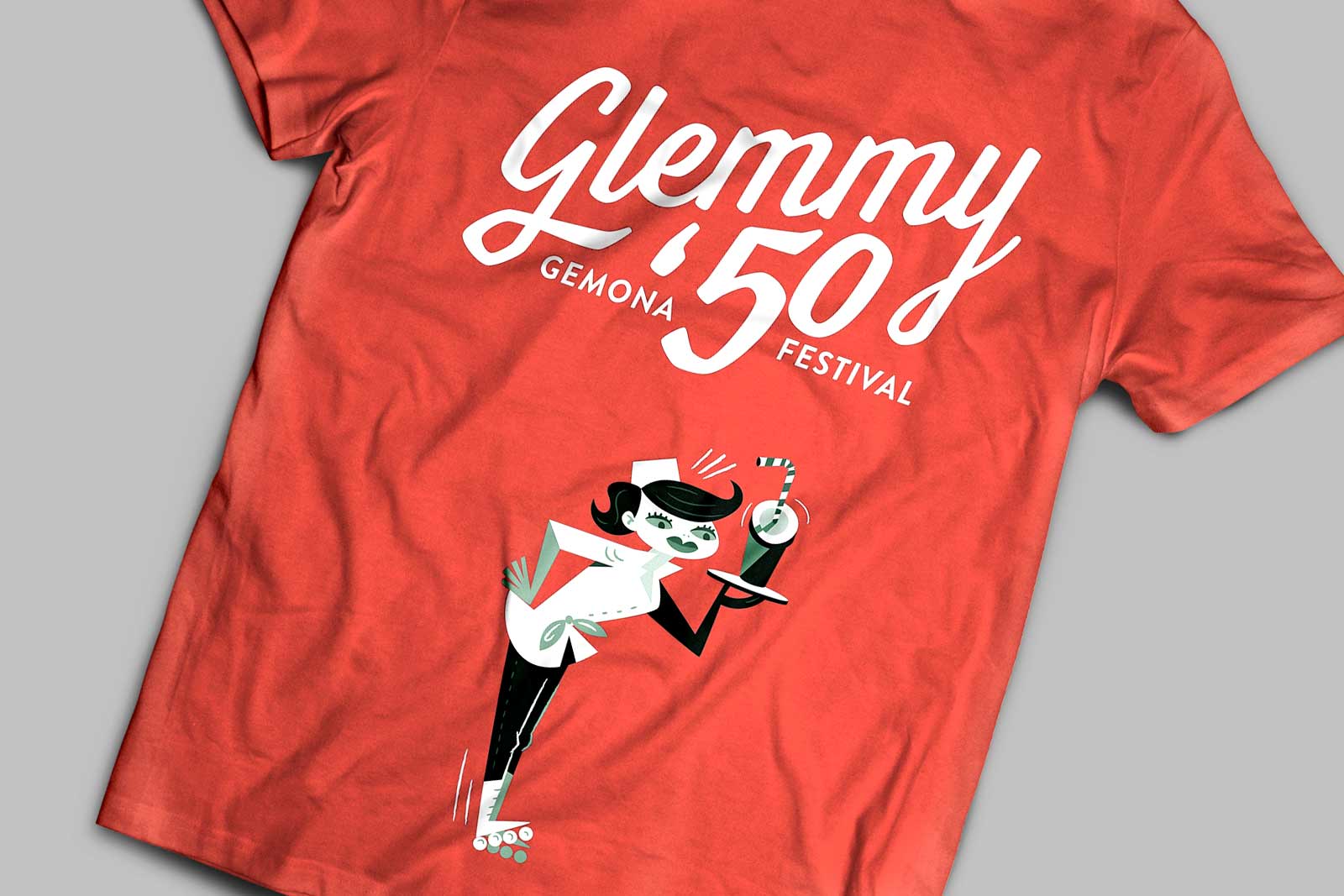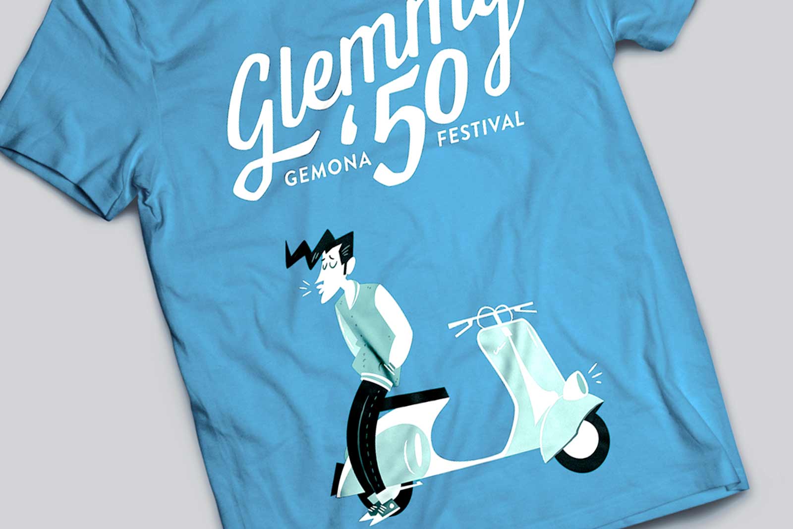 A Gemona, Glemone in friulano, un Festival sugli anni ‘50: cinema all’aperto, esposizioni di memorabilia e cultura pop, sfilate di Vespa, concerti rock e balli acrobatici, dress code ispirati a Happy Days ma anche ai Vitelloni felliniani. Abbiamo prodotto un nome, Glemmy, e un manifesto che si anima in uno spot per i social. Va da se che per ogni elemento del manifesto ci è stato subito chiesto di ricavarne i gadget: T-shirt e spille soprattutto.