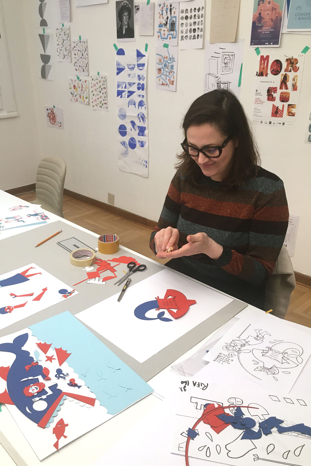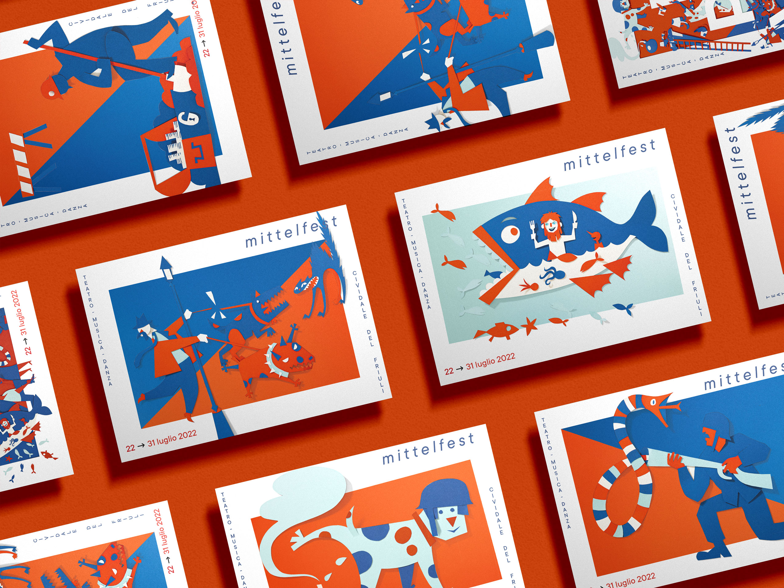 “L’immagine Mittelfest 2022 Imprevisti, ad esempio, è l’esito di un lungo lavoro di taglio e assemblaggio di pezzi in carta, poi fotografati: le ombreggiature della carta fotografata sono imprevedibili di per sé e sarebbero impossibili se il lavoro fosse stato condotto soltanto in digitale. C’è una concretezza maggiore, un senso di tangibilità del visivo”.