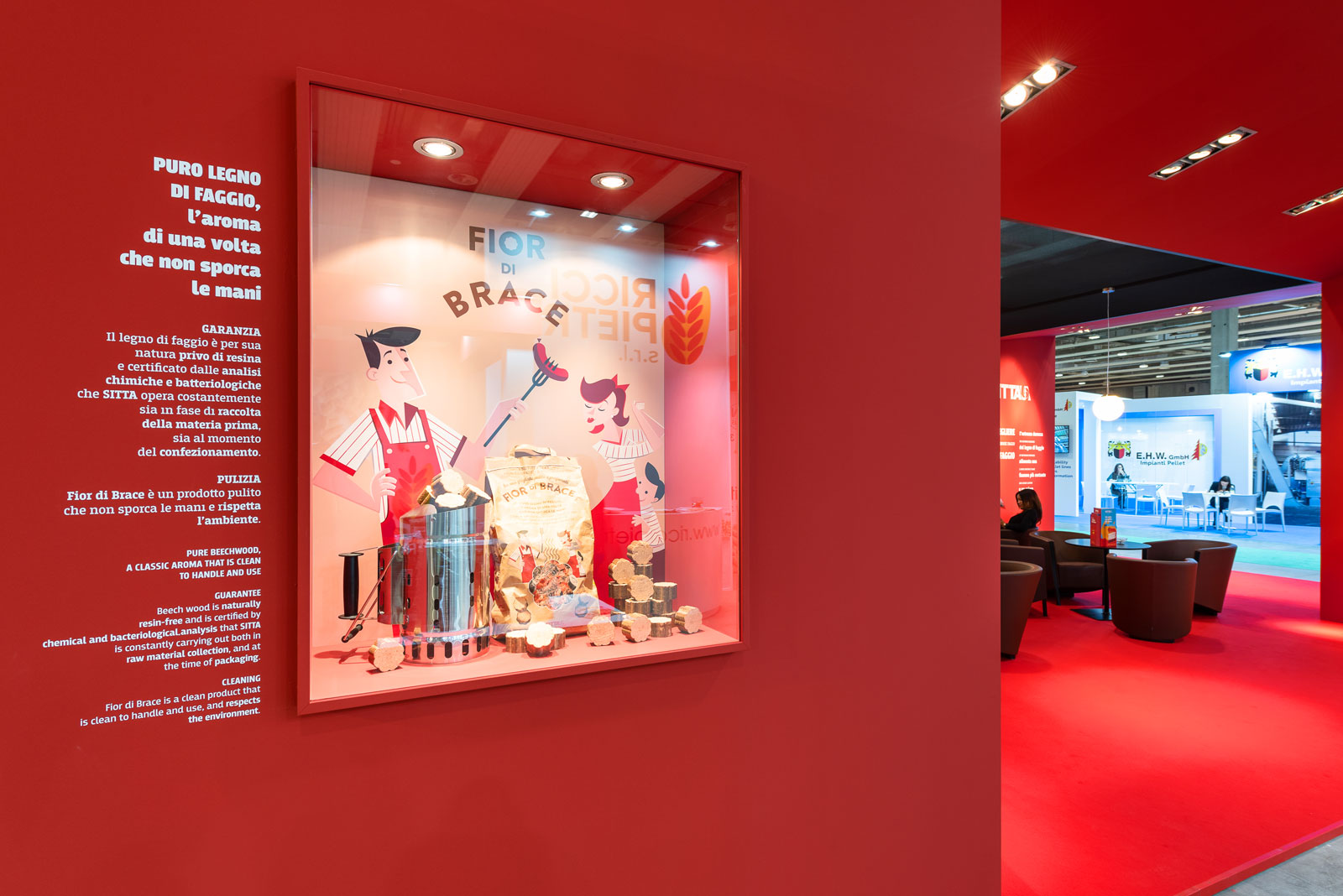 “Qui il designer ha dimostrato come realizzare uno stand mozzafiato utilizzando un solo colore, senza una pedana rialzata, giocando con forme essenziali e con la prospettiva. Complimenti!”